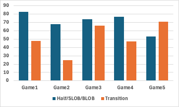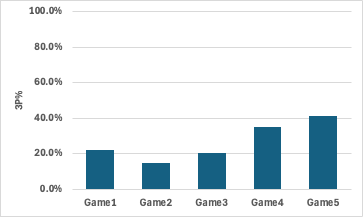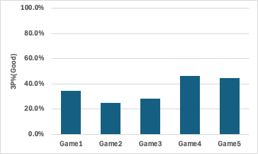並べて見てみると、Game5は2P%も3P%も高いものの、その他4試合は2P%のみ高かったり3P%のみ高かったり、あるいはどちらも低かったりする。