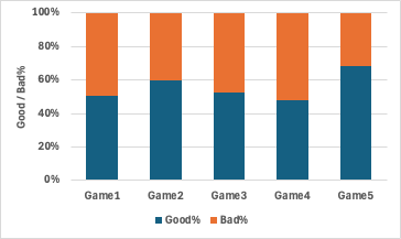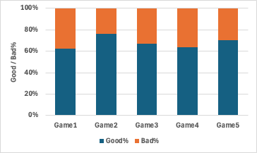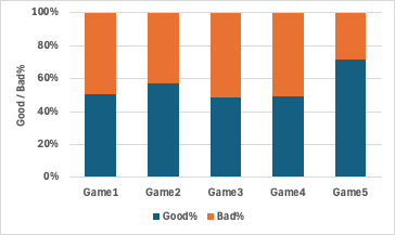 グラフで示した5試合のGood時成功率は平均37.4%で、試合ごとでは25.0%~46.4%の範囲に収まっていた。