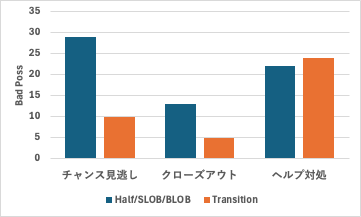 一方、Transitionではヘルプ対処が圧倒的で、チャンス見逃しとクローズアウトは僅かだった。