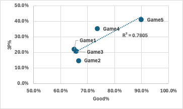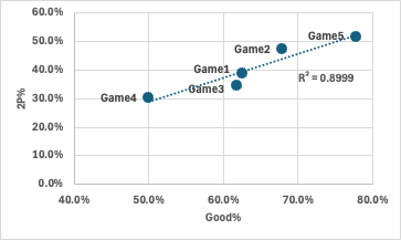 2PTも3PTも、Good%が高い試合ほどショット成功率が高くなる傾向があるように見える。